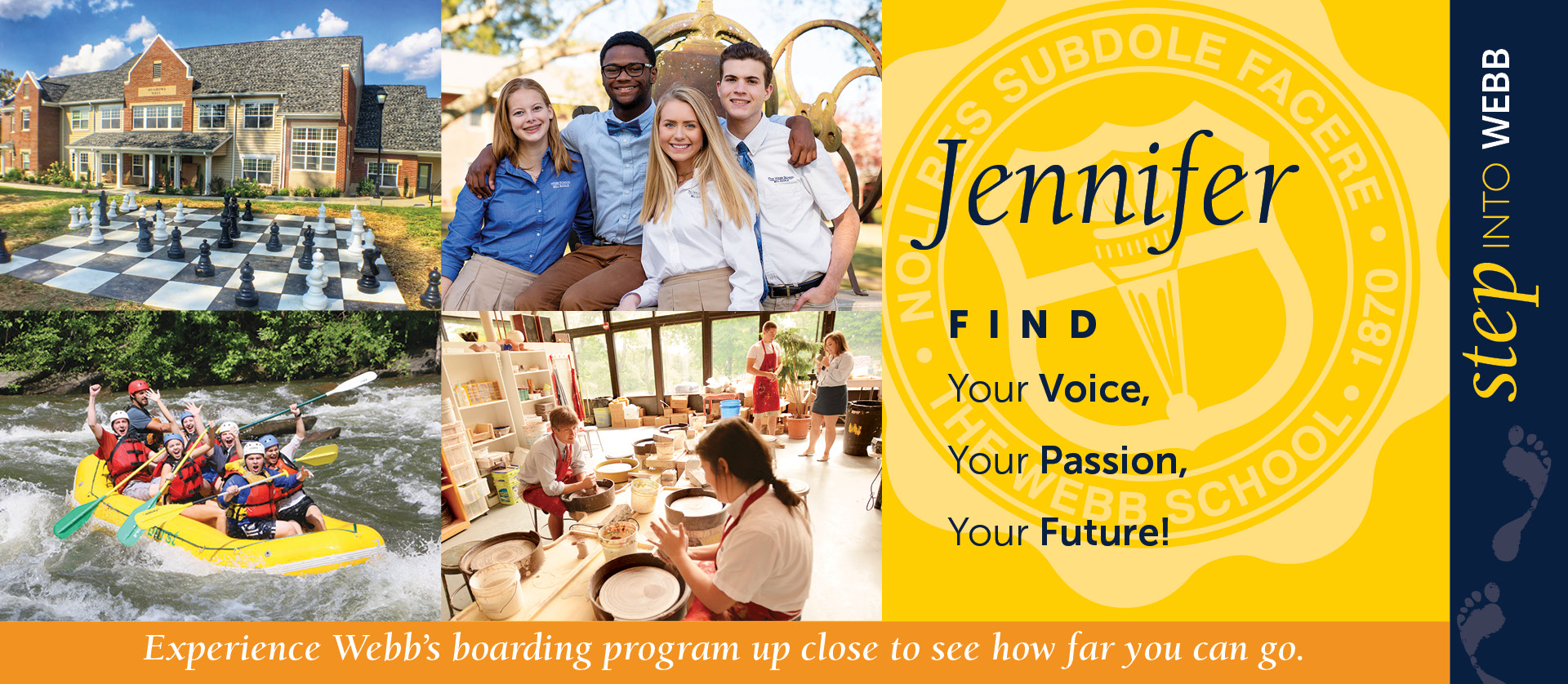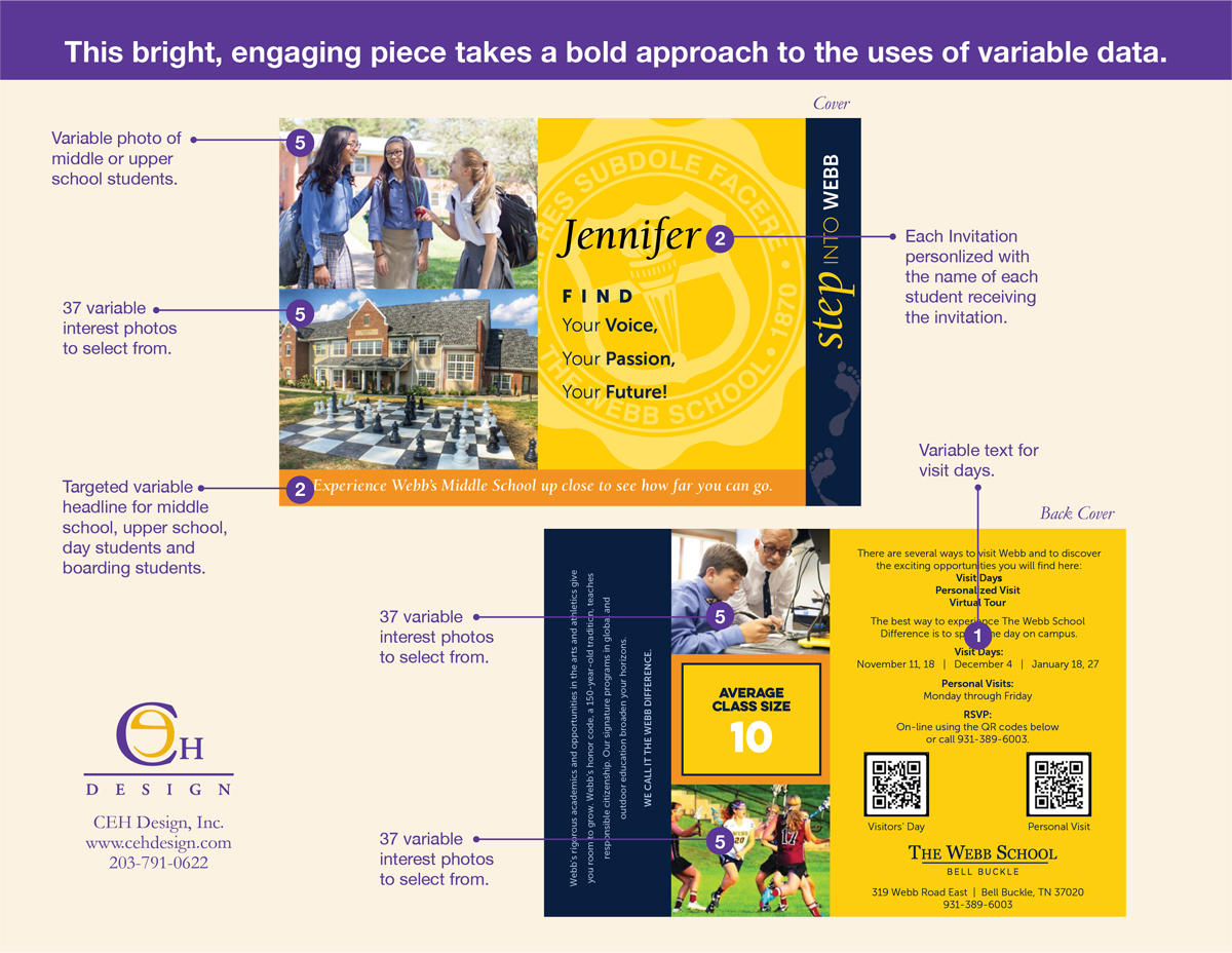 Using variable data, CEH Design designed this invitation that could be personalized in multiple ways. In addition to addressing each recipient by (1) name on the cover, variable data allows for targeted headlines, (2) copy, and (3) photographs, chosen to reflect the recipient’s grade level, interest in a boarding or day program, extracurricular and sports interests, and town and state of origin. (4) Quotes from current students are selected to match the recipient with someone from their area. With this bright, engaging piece that takes a bold approach to the use of variable data, The Webb School has seen the largest response ever in sign-ups for their visit days.