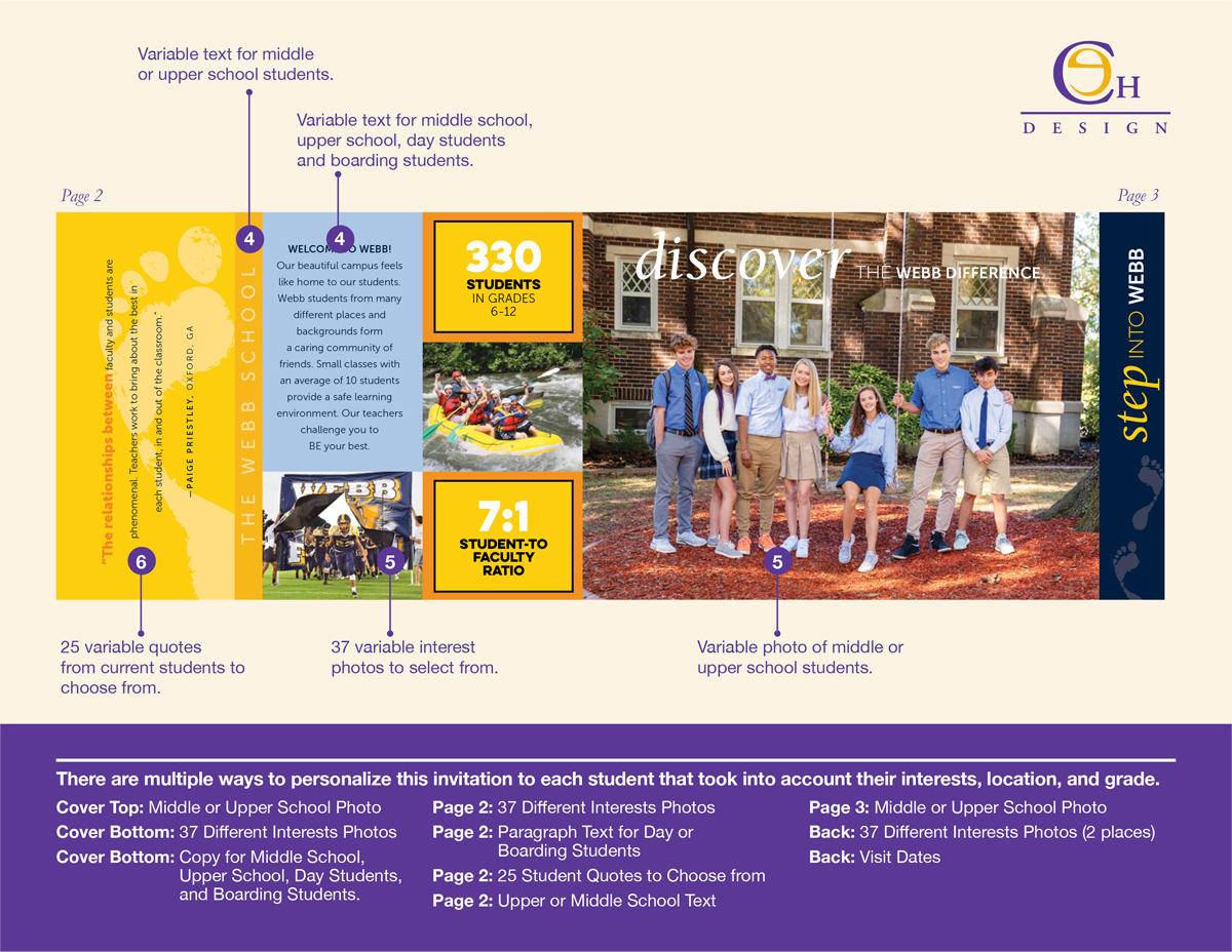 For The Webb School, CEH Design addressed these considerations with a four-panel card to publicize the visit days, personalized visits, and virtual tours hosted by the Admissions Office. This highly technical and result-driven piece gave The Webb School over 7000 custom variations with just 37 interest photos. With the additional variable components, the numbers go up exponentially. This gave Webb the opportunity to truly target each prospective student.