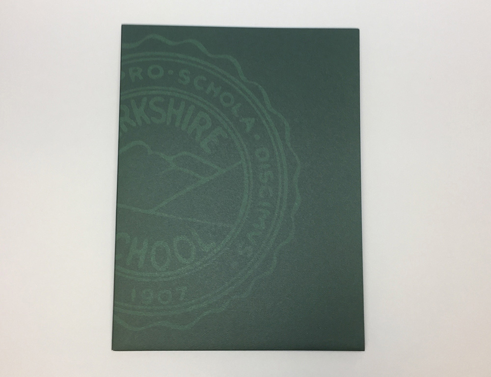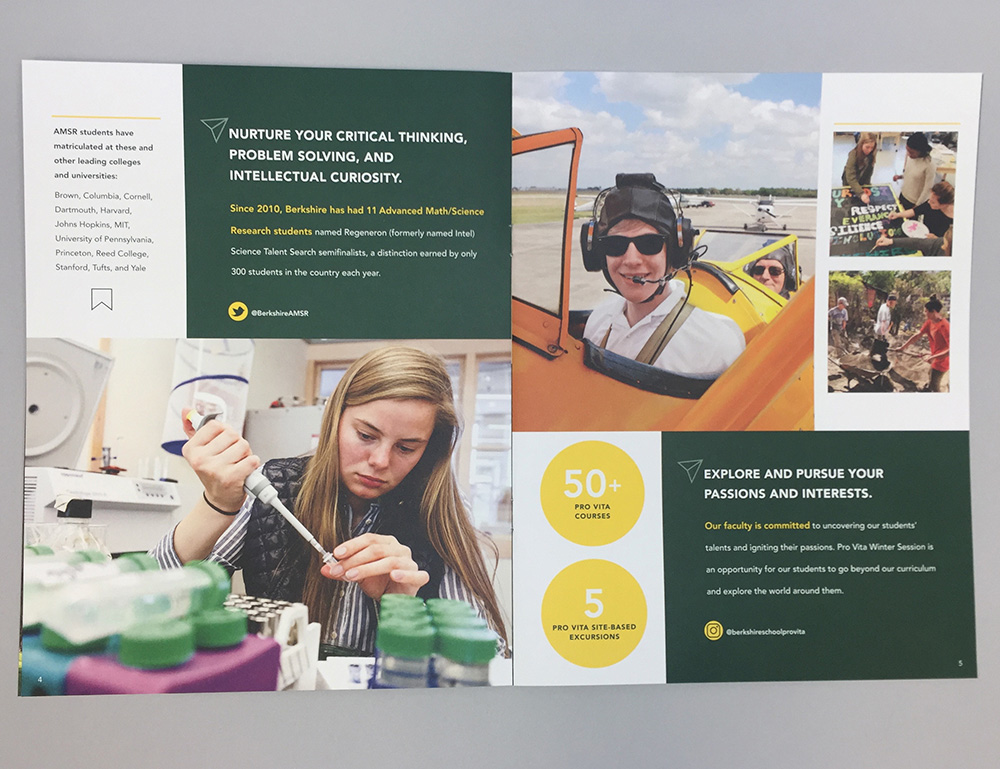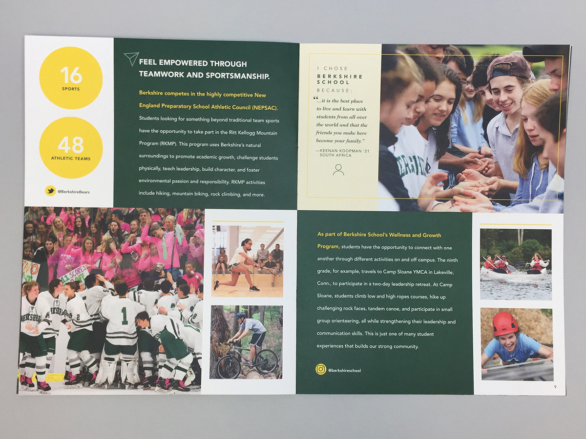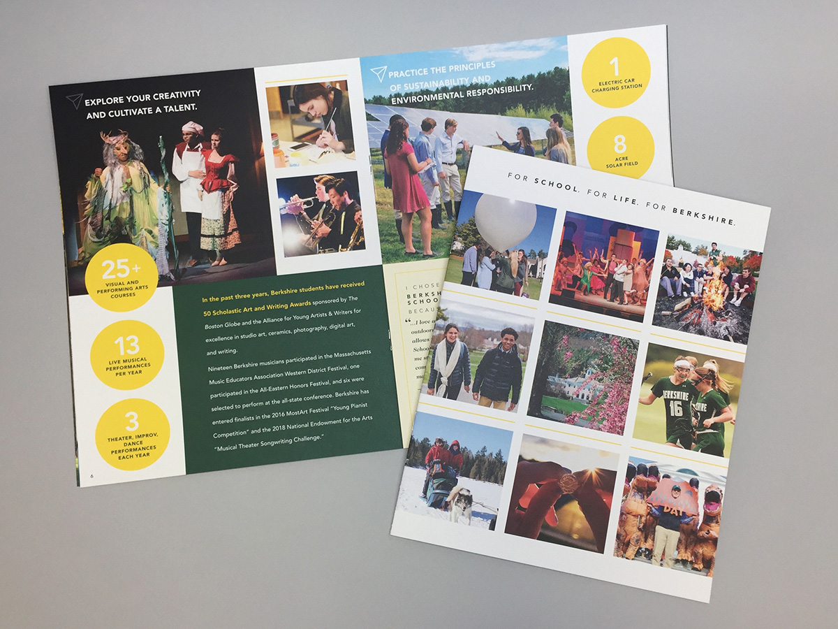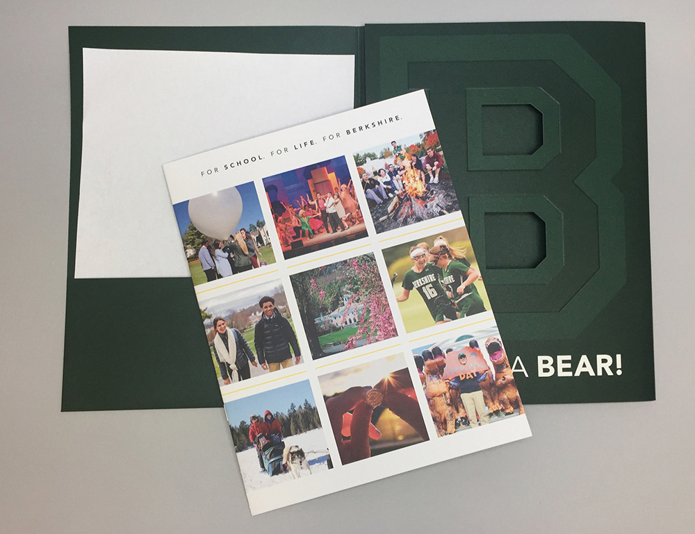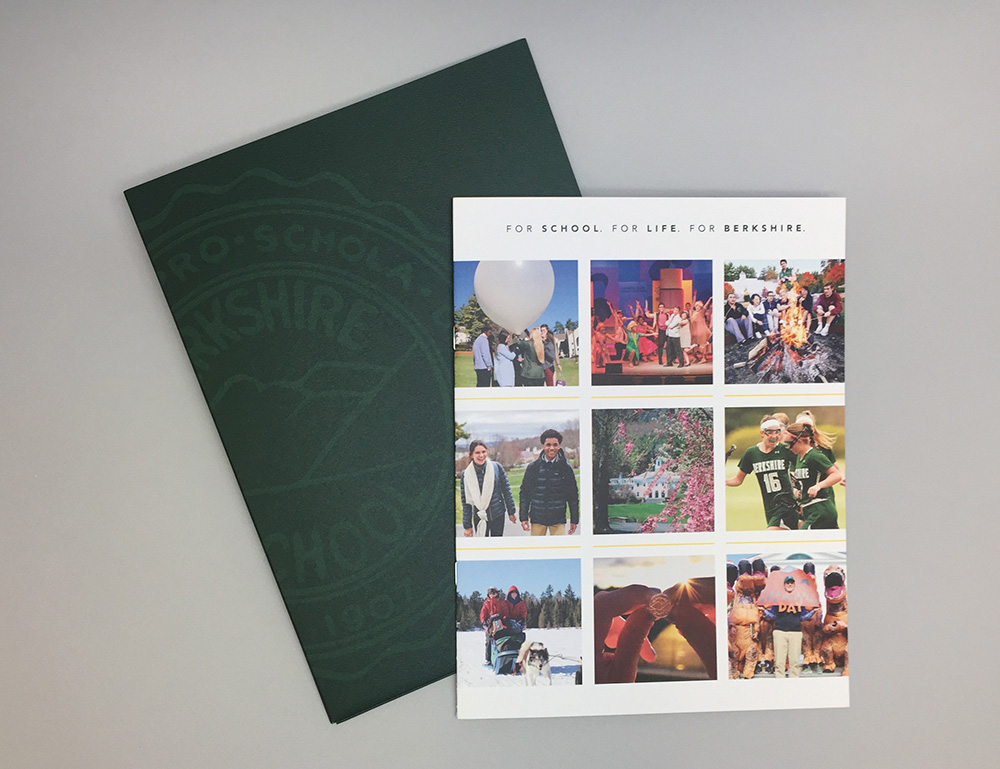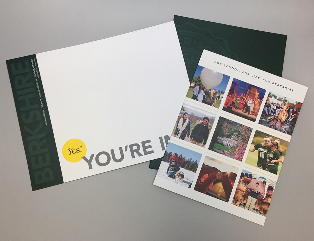 This is a custom-designed package (envelope, dye-cut folder, belly wrap closure, and 16-page brochure) that is sent to admitted students with their acceptance papers. This branded marketing piece communicates Berkshire's mission, values, and the academic and student life experience on campus. The brochure features social media design elements to entice the reader and highlights bold statistics about the School and quotes from current students. The goal of this piece is to increase our yield.