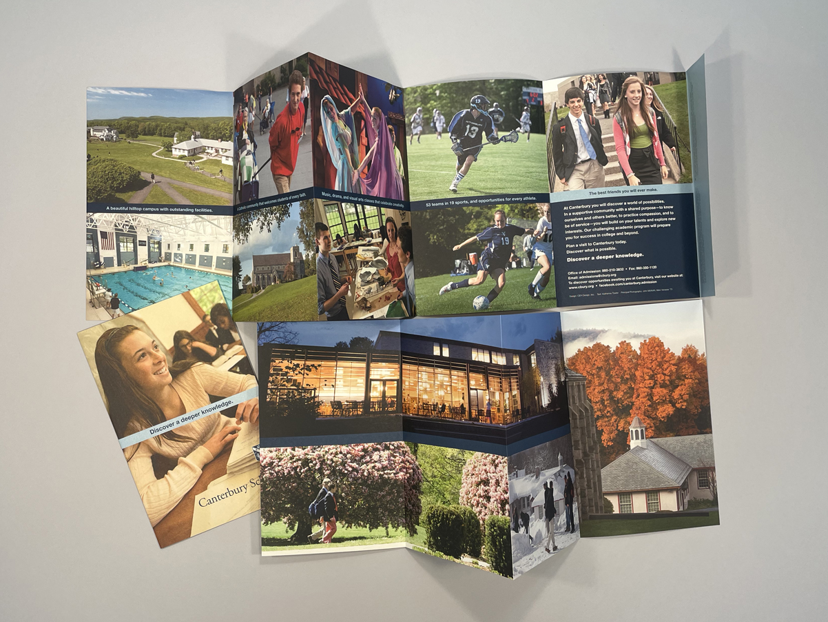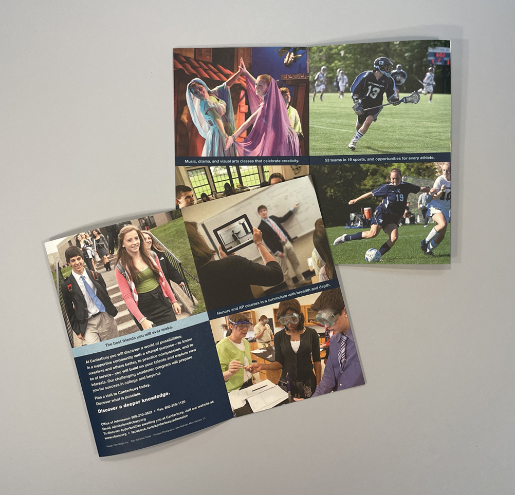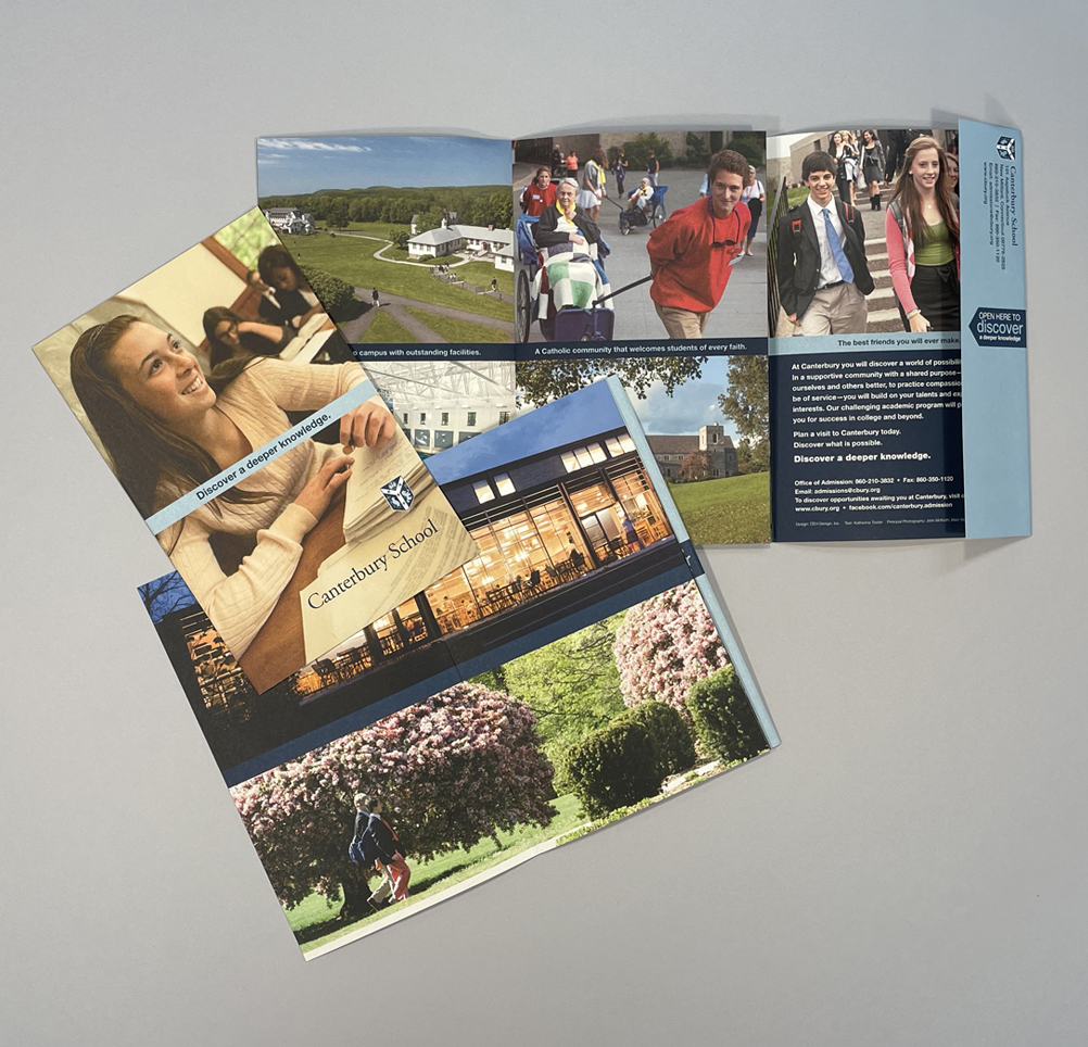 This fold-out self-mailer was designed with keen photography that was accompanied by minimal text. The search featured Caterbury’s picturesque campus, robust academics, outstanding arts, strong athletics, and their compassioned community.