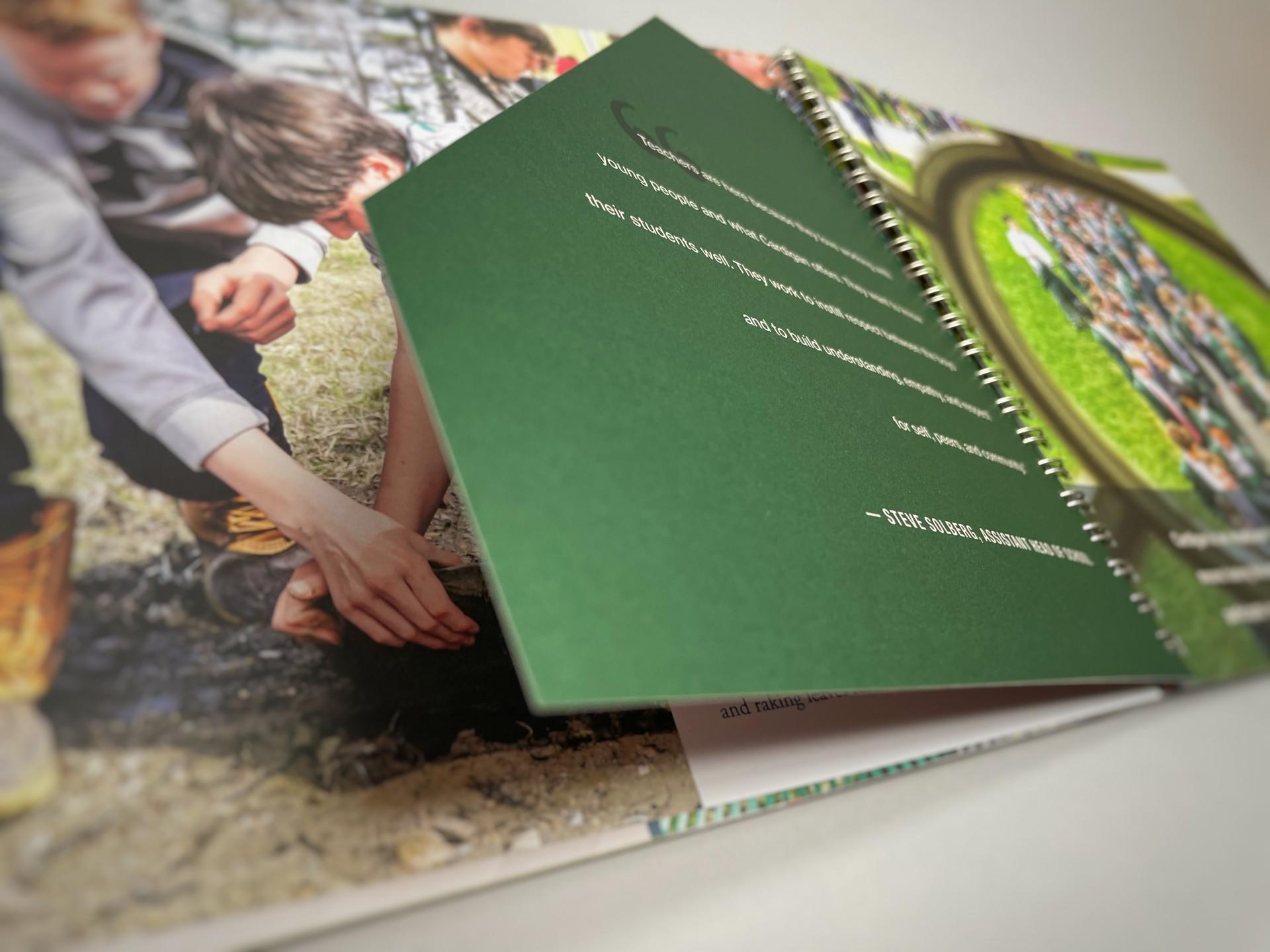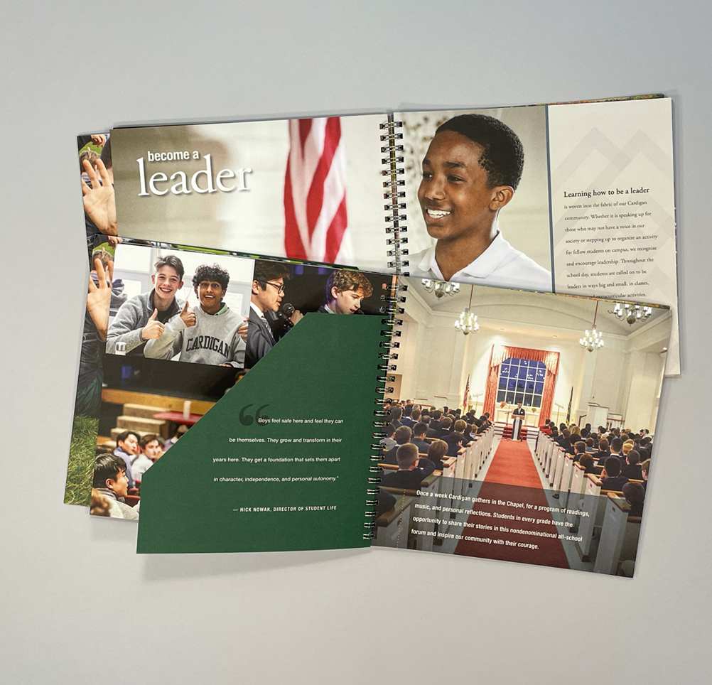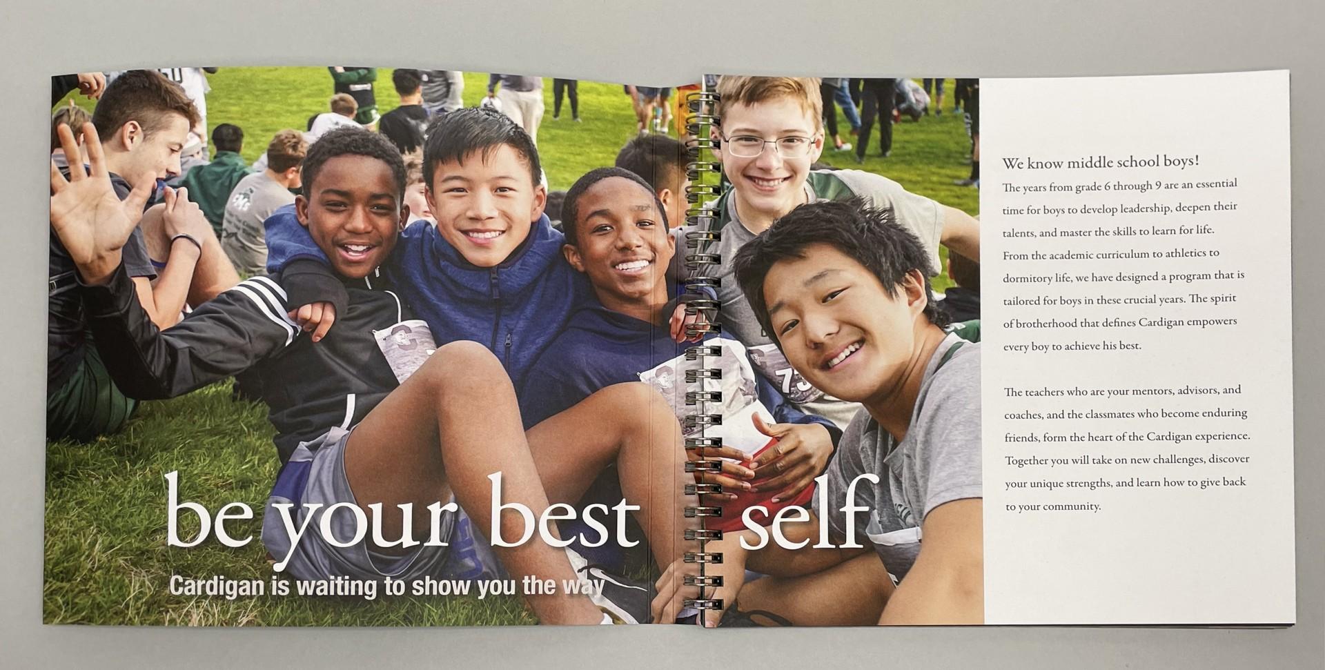 Cardigan’s viewbook uses bold headlines to speak directly to the prospective student. Paired with outstanding photography and a clean but dynamic design, the viewbook sends the message that Cardigan knows middle school boys and how to challenge them academically and make them feel at home. Half-pages throughout the book highlight the school’s core values and how they are put into action in the classroom, on the playing fields, and in dormitory life. Heavier paper stock with a textured surface for the half-pages engages the senses and makes this a tactile as well as a visual piece. The viewbook makes a compelling case for the transformation boys experience at Cardigan and sells the benefits of a single-sex education for boys this age.