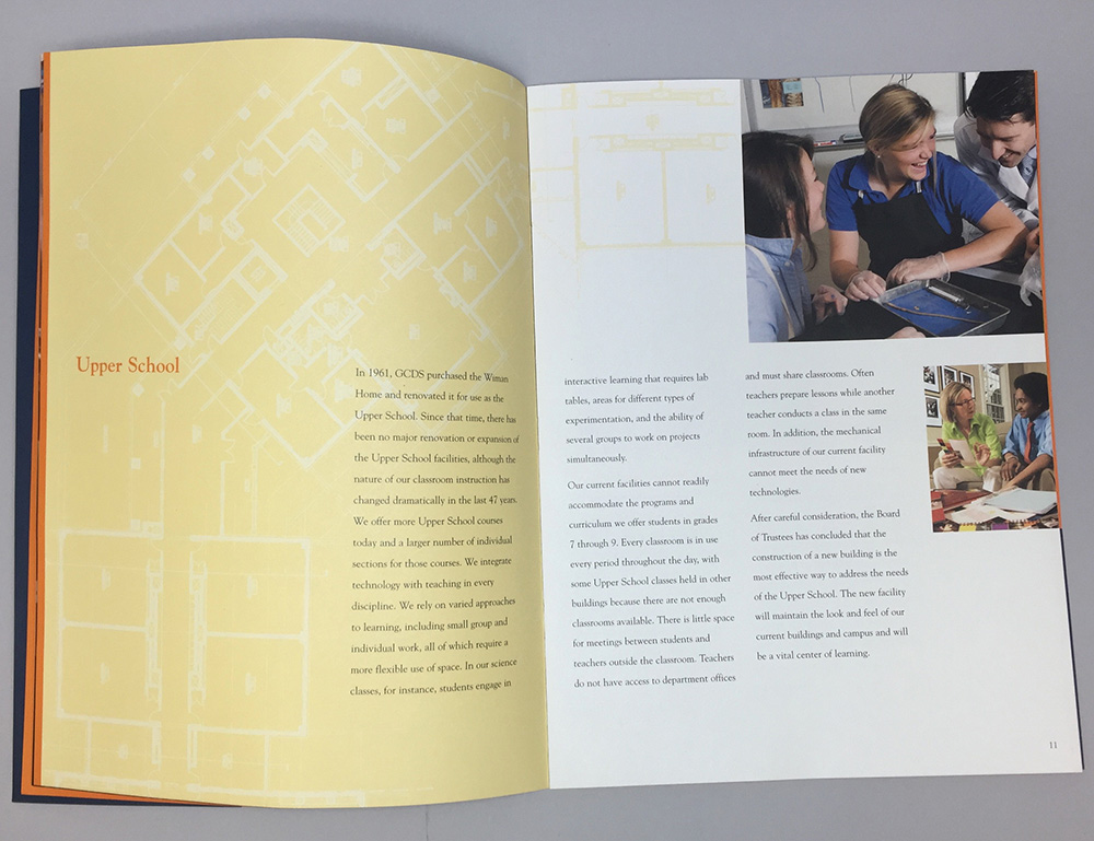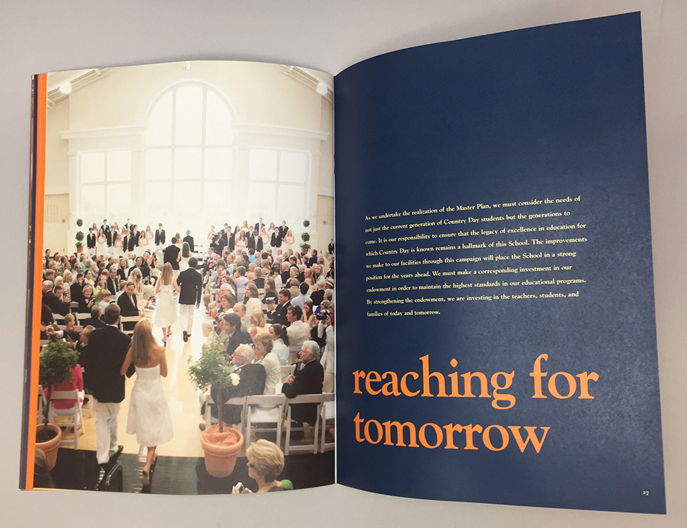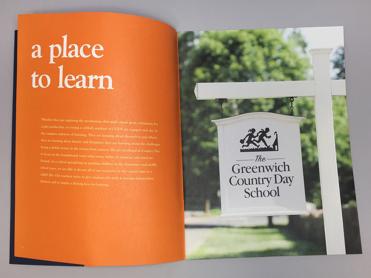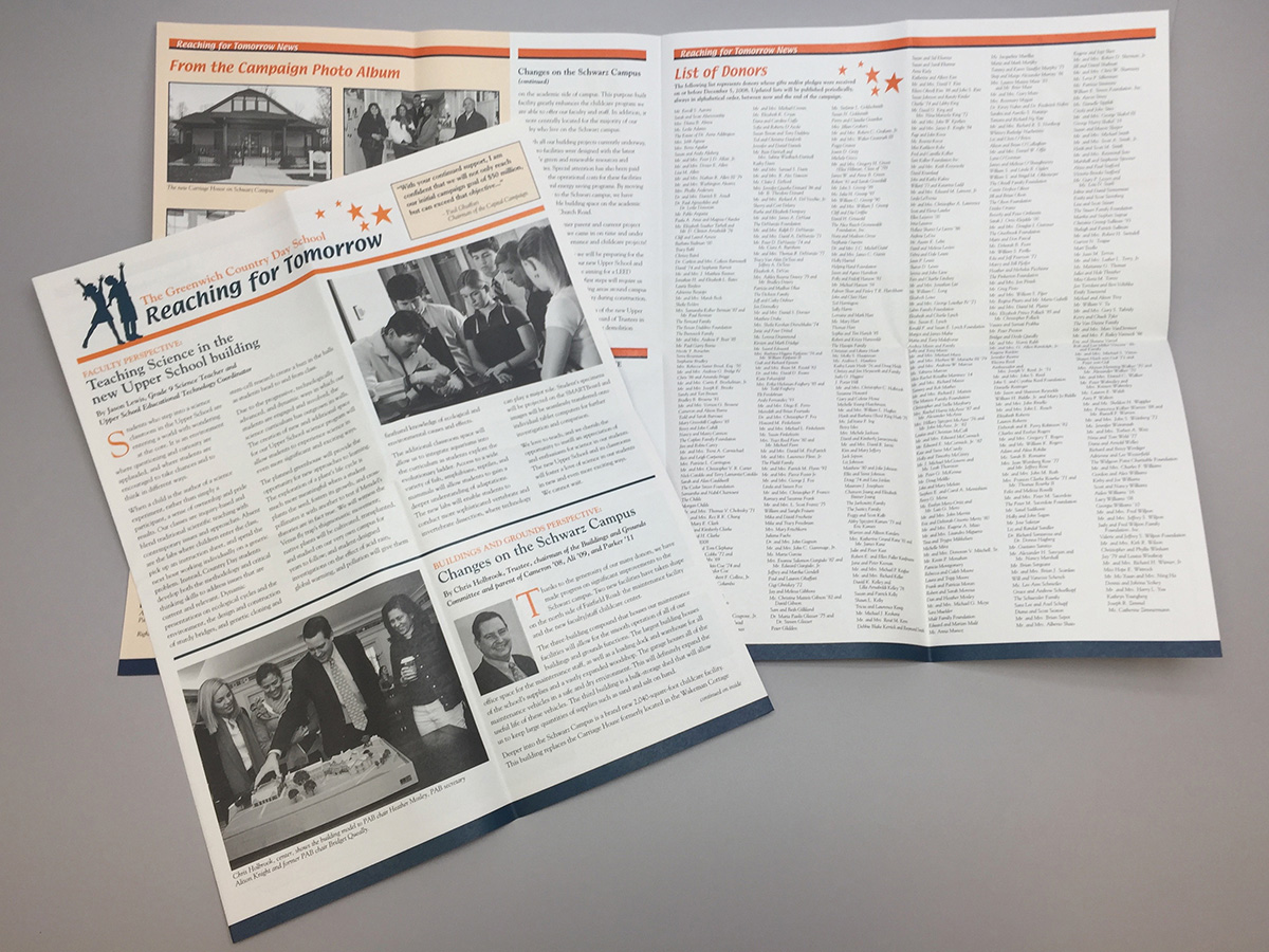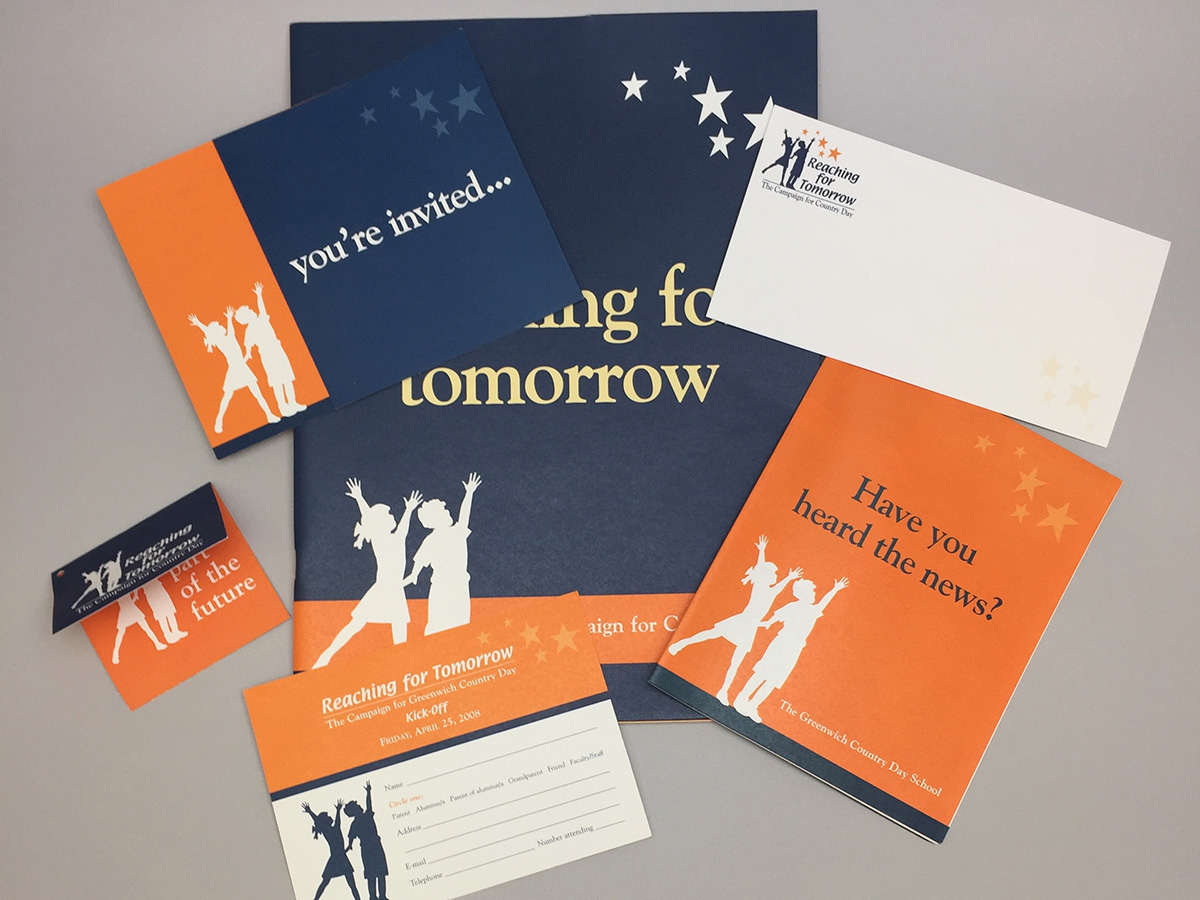 Greenwich Country Day School hired CEH Design to create a brand identity for their capital campaign. CEH works seamlessly with the Development Director, Communications Director, Head of School and board members to develop a timeless theme and graphic elements that works with their current brand. The goal of raising funds for a new Upper School facility, a theater, and faculty housing, the campaign focused on both capital improvements and the people who bring their diverse talents to the school community. CEH Design crafted the campaign tagline — “Reaching for Tomorrow” – logo and produced a print case statement with bright colors and exciting design, strong visuals, and text that makes a strong case for Greenwich Country Day’s unique strengths and for its future — that ultimate surpassed their goals.