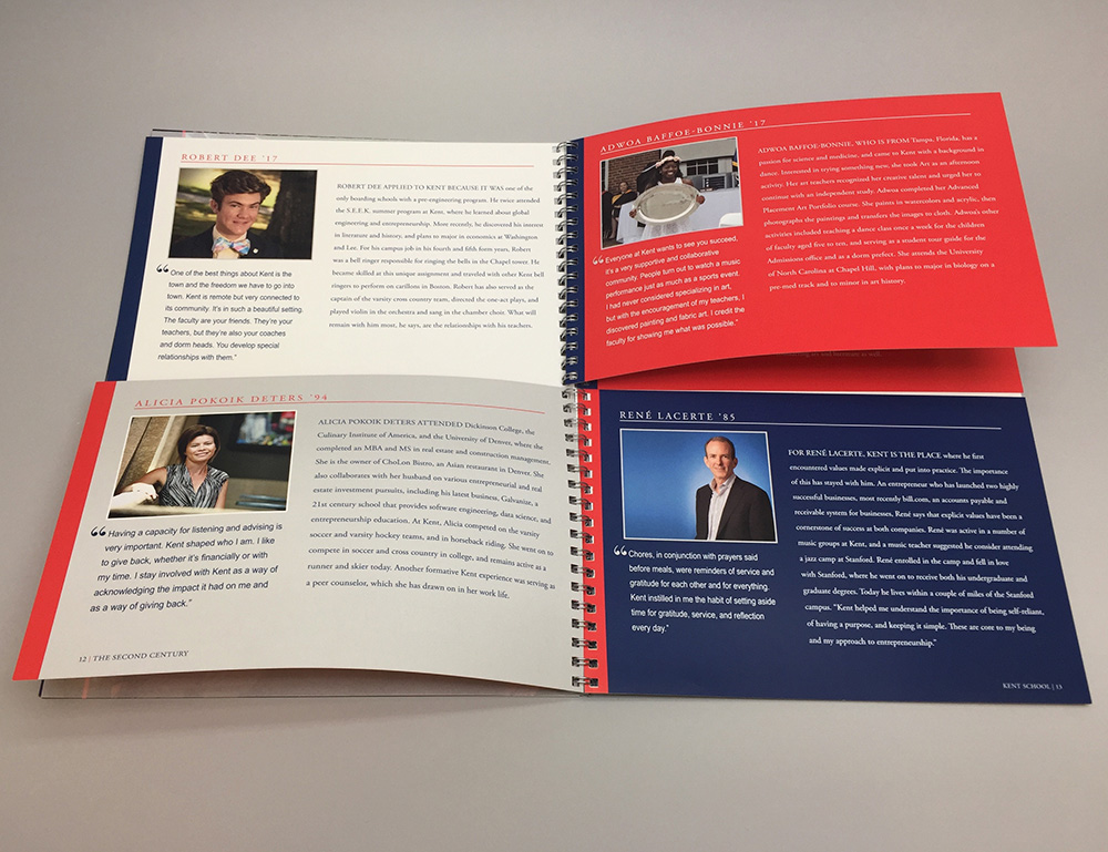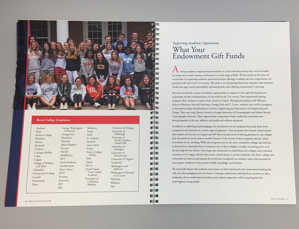 The Kent School, a long-time client of CEH Design, has hired us to produce admissions and fundraising pieces that reflect the school’s culture and history and motivate prospective applicants and donors. For the school’s Second Century campaign launched in coordination with Kent’s centennial, CEH Design crafted a case statement with a clear, concise presentation of the school’s fundraising history and current needs, inspiring profiles of alumni, and a persuasive call to action. Kent exceeded its $200 million goal to support endowment for faculty salaries, academic programs, and scholarship aid with the help of this beautifully designed print piece.