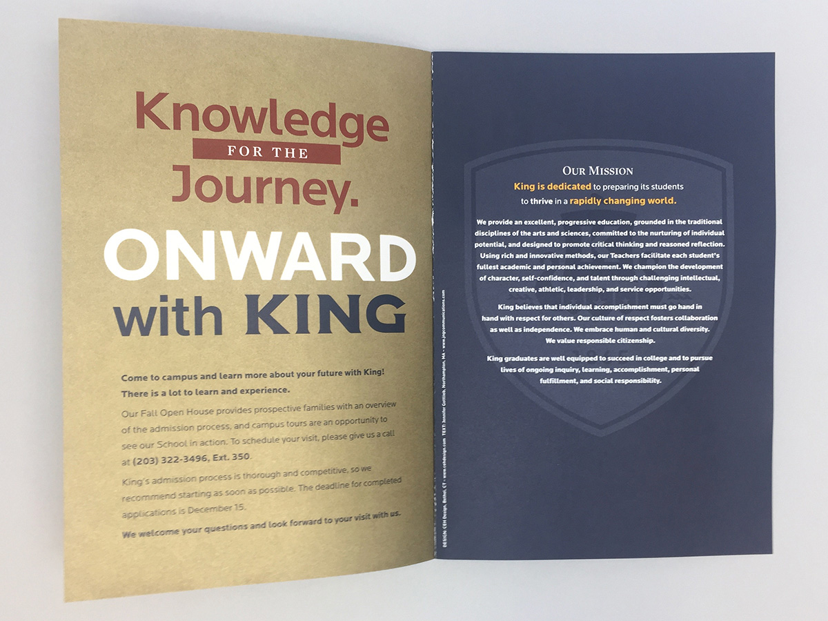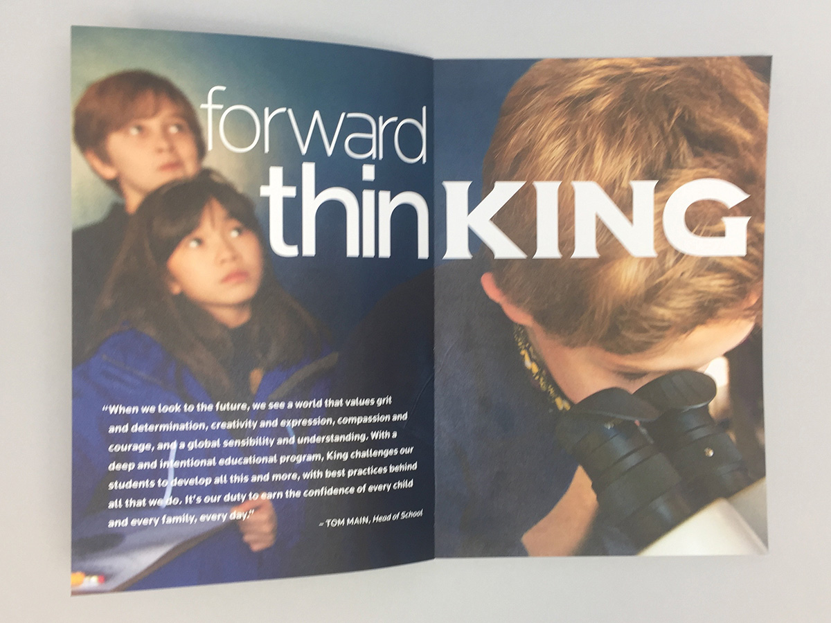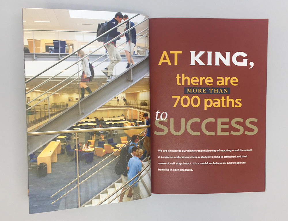 King is an innovative school with depth and complexity – which wasn’t completely coming through in their collateral. Our team tapped into King’s key differentiators and created a tagline and materials to reflect their bold vision and engaged, enthusiastic student body. We exceeded expectations with a book broken into four parts, providing an overview of King as a whole before getting specific about each of the three divisions, Upper, Middle, and Lower. On the eve of the school’s sesquicentennial, the piece needed to be timely but also enduring. How could we highlight this milestone without dating the book? Our cost-effective solution – a die-cut wrap with an accordion-fold brochure celebrating King’s 150th anniversary and history – provides detail, dimension… and shelf life. Like the school itself, King’s viewbook is friendly, creative, accessible, and inspiring.