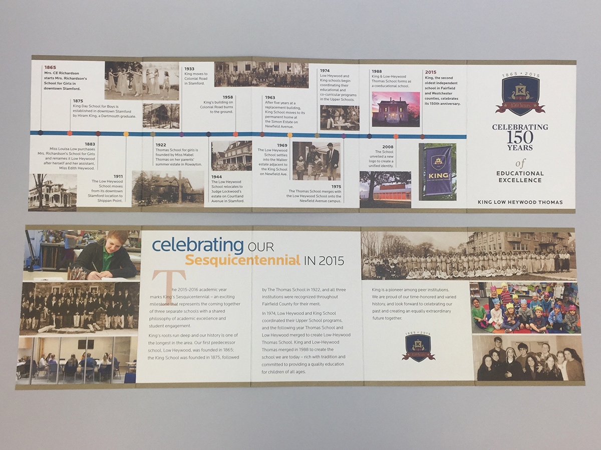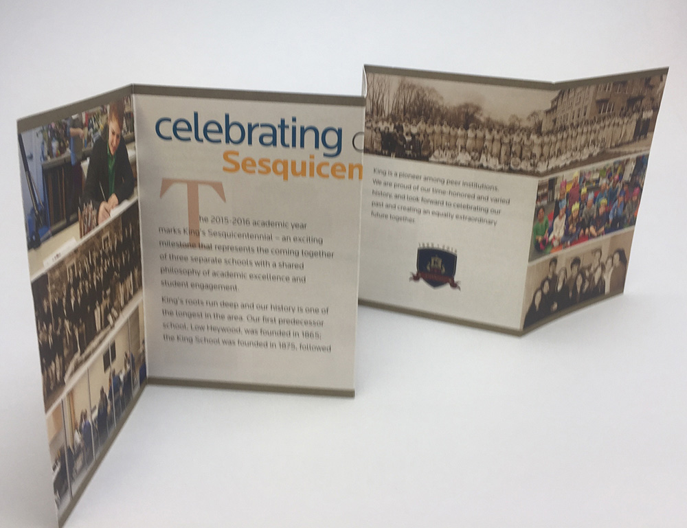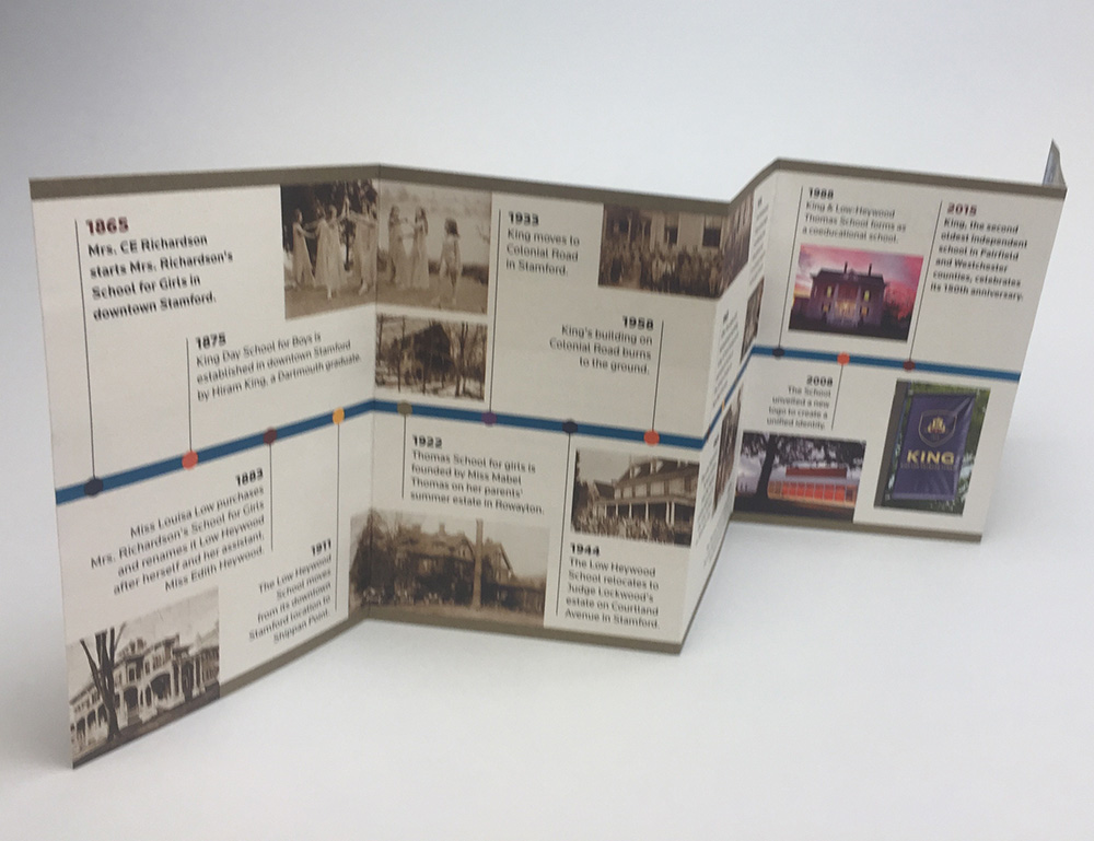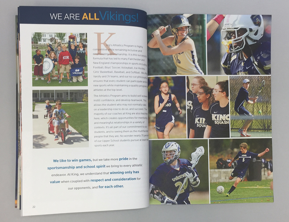 King is an innovative school with depth and complexity – which wasn’t completely coming through in their collateral. Our team tapped into King’s key differentiators and created a tagline and materials to reflect their bold vision and engaged, enthusiastic student body. We exceeded expectations with a book broken into four parts, providing an overview of King as a whole before getting specific about each of the three divisions, Upper, Middle, and Lower. On the eve of the school’s sesquicentennial, the piece needed to be timely but also enduring. How could we highlight this milestone without dating the book? Our cost-effective solution – a die-cut wrap with an accordion-fold brochure celebrating King’s 150th anniversary and history – provides detail, dimension… and shelf life. Like the school itself, King’s viewbook is friendly, creative, accessible, and inspiring.
