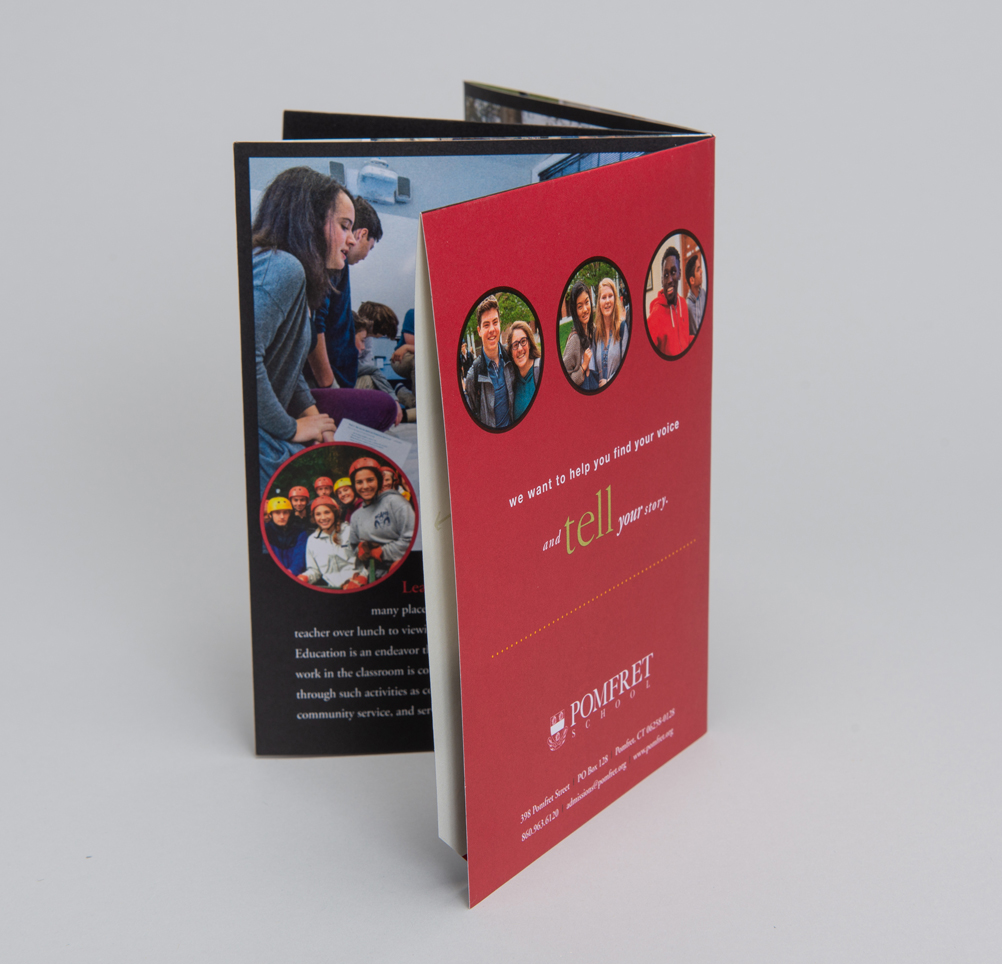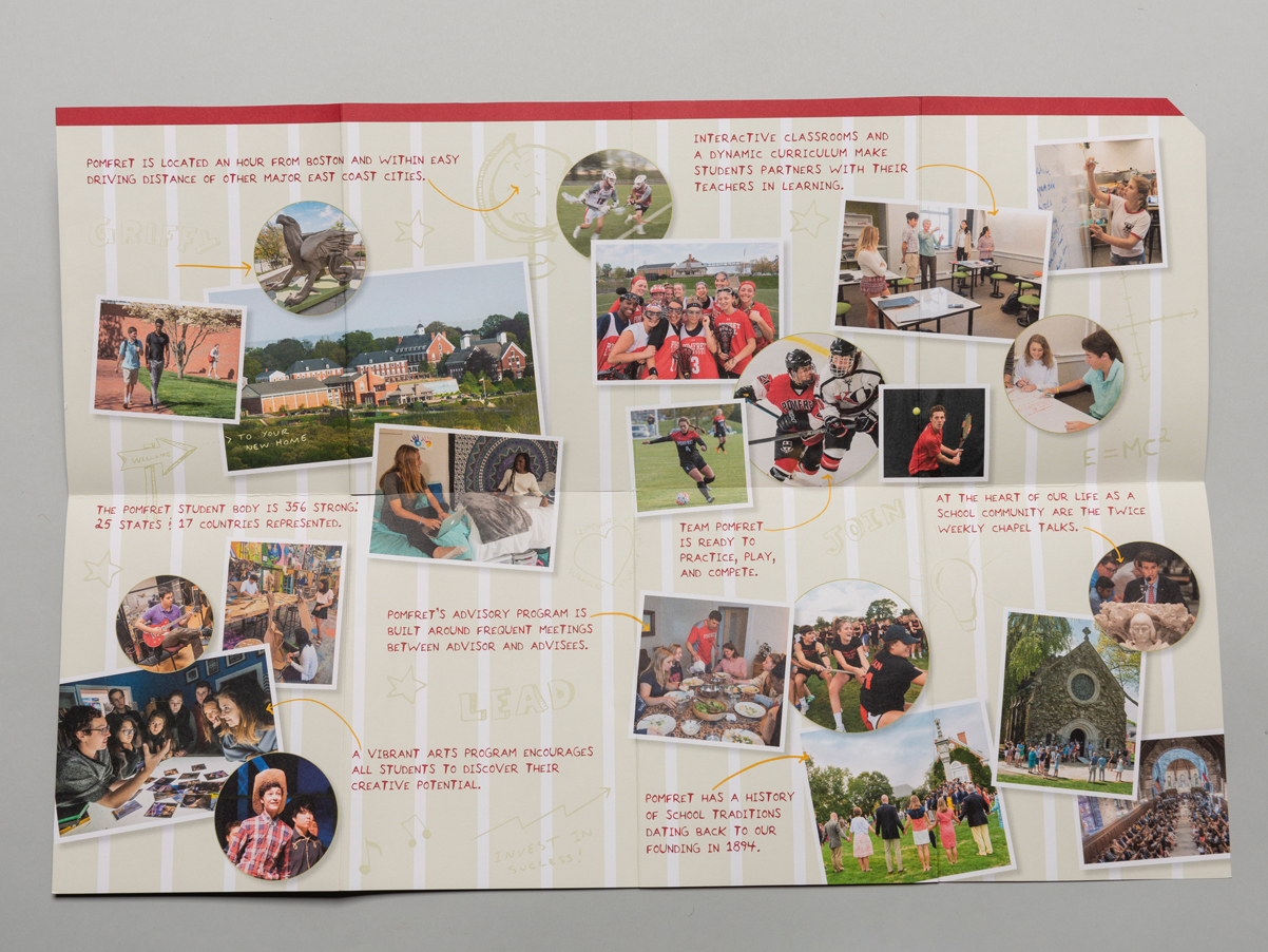 For the search piece, we created a fold-out that matches the viewbook in look and theme. When fully opened to a poster, this piece is designed like a scrapbook page with a fun collection of photos and bold captions that give nuggets of information about campus and community life.