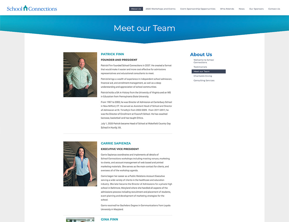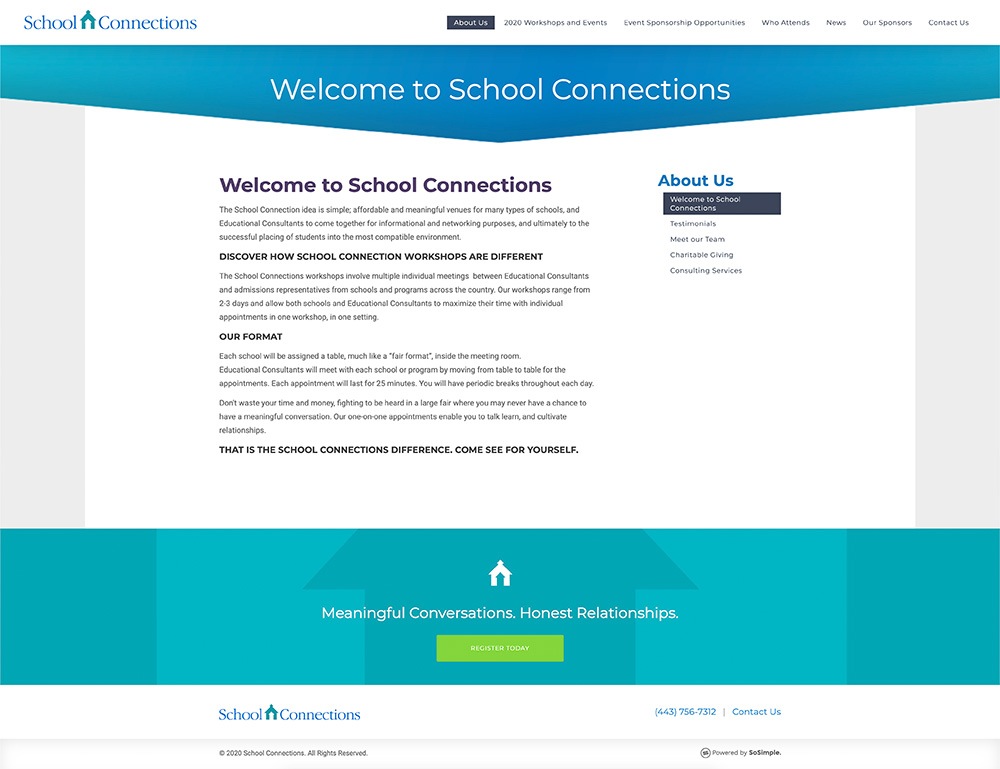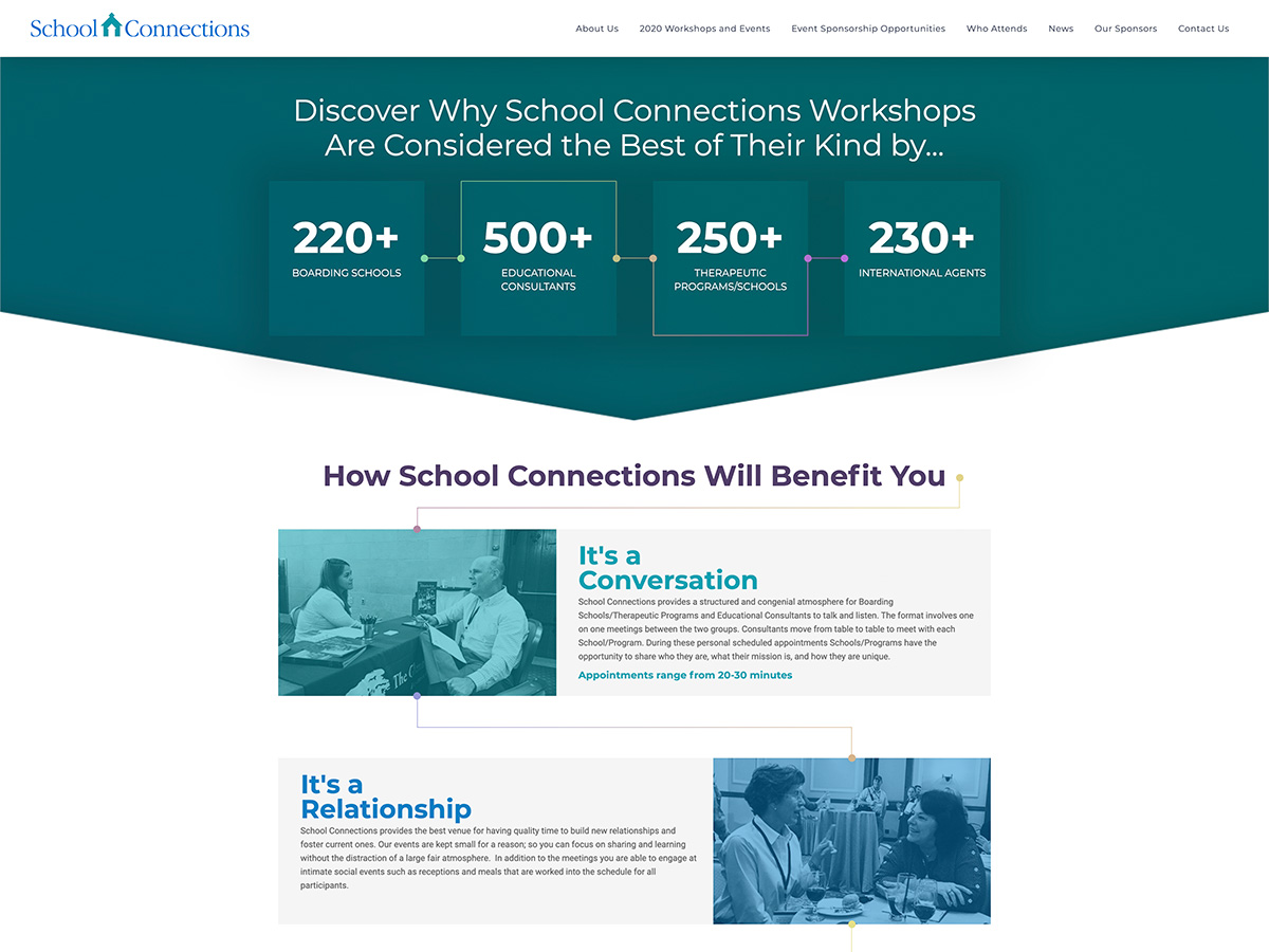 School Connections was new company that developed the best in class workshops that brings educational consultants, international agent and boarding schools from all over the world together. School Connections engaged with CEH Design to create their brand strategy. Carolyn worked closely the founder to develop their logo, messaging, website, brochures and advertisements. Her relation with School Connections spans more than 10 years seeing it grow to the industry leader that others have tried to replicate, and non have succeed.