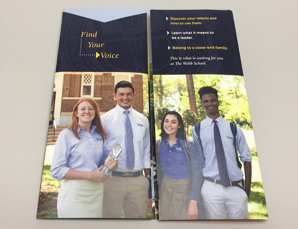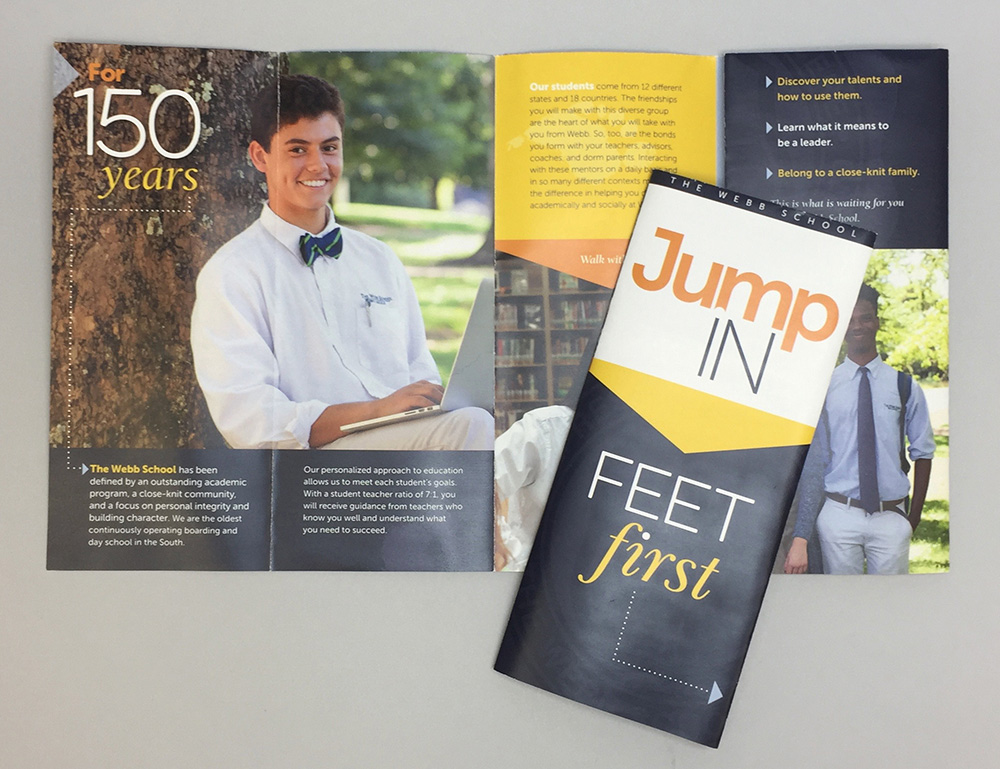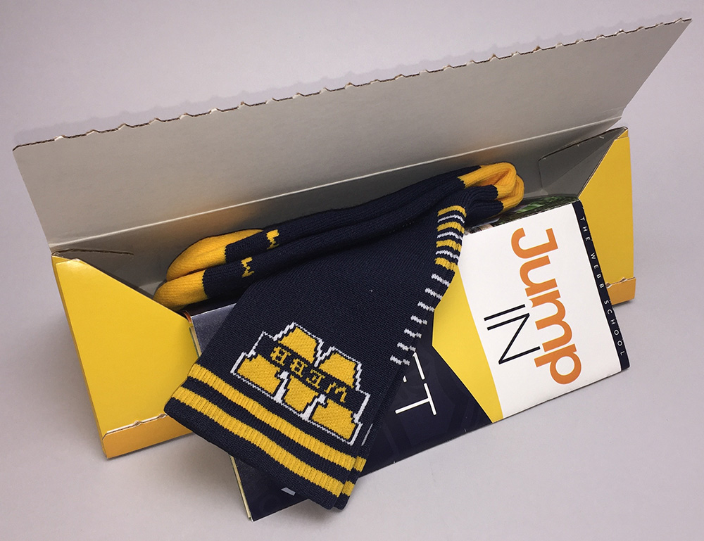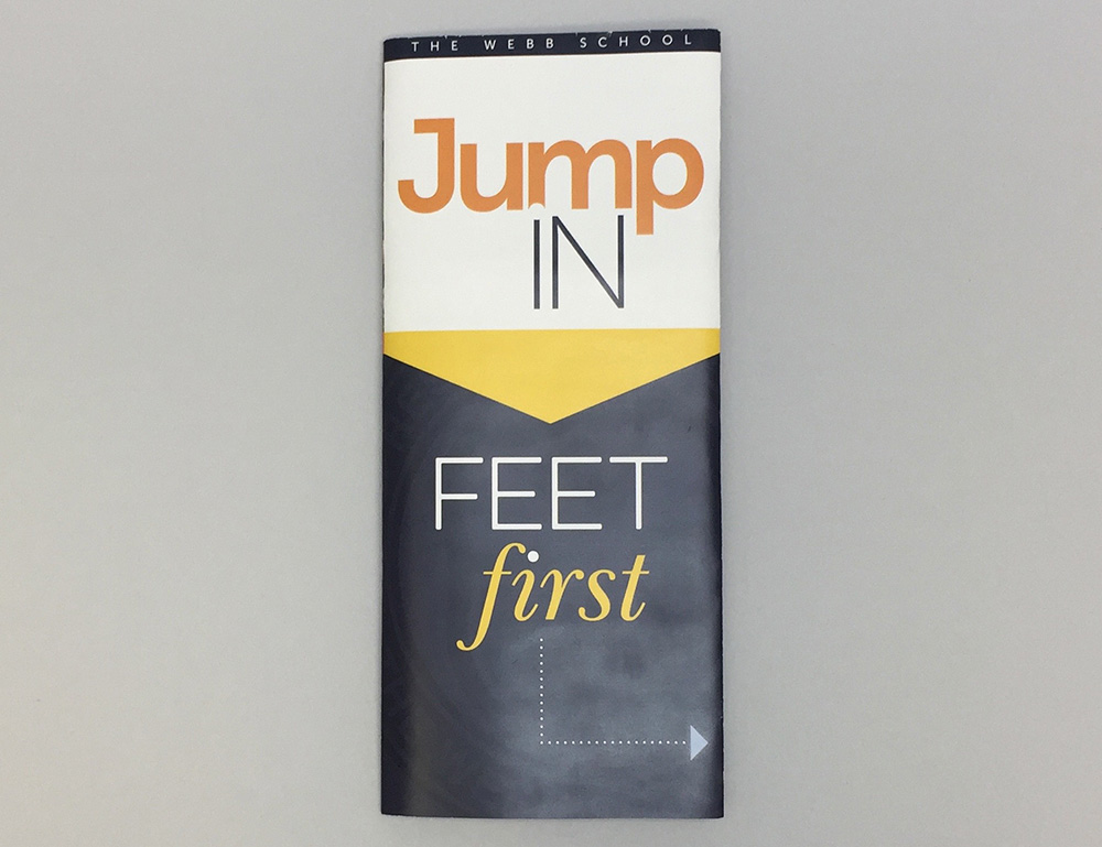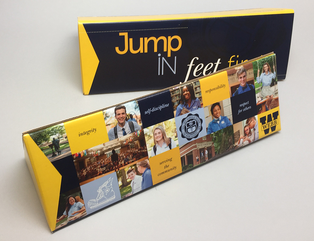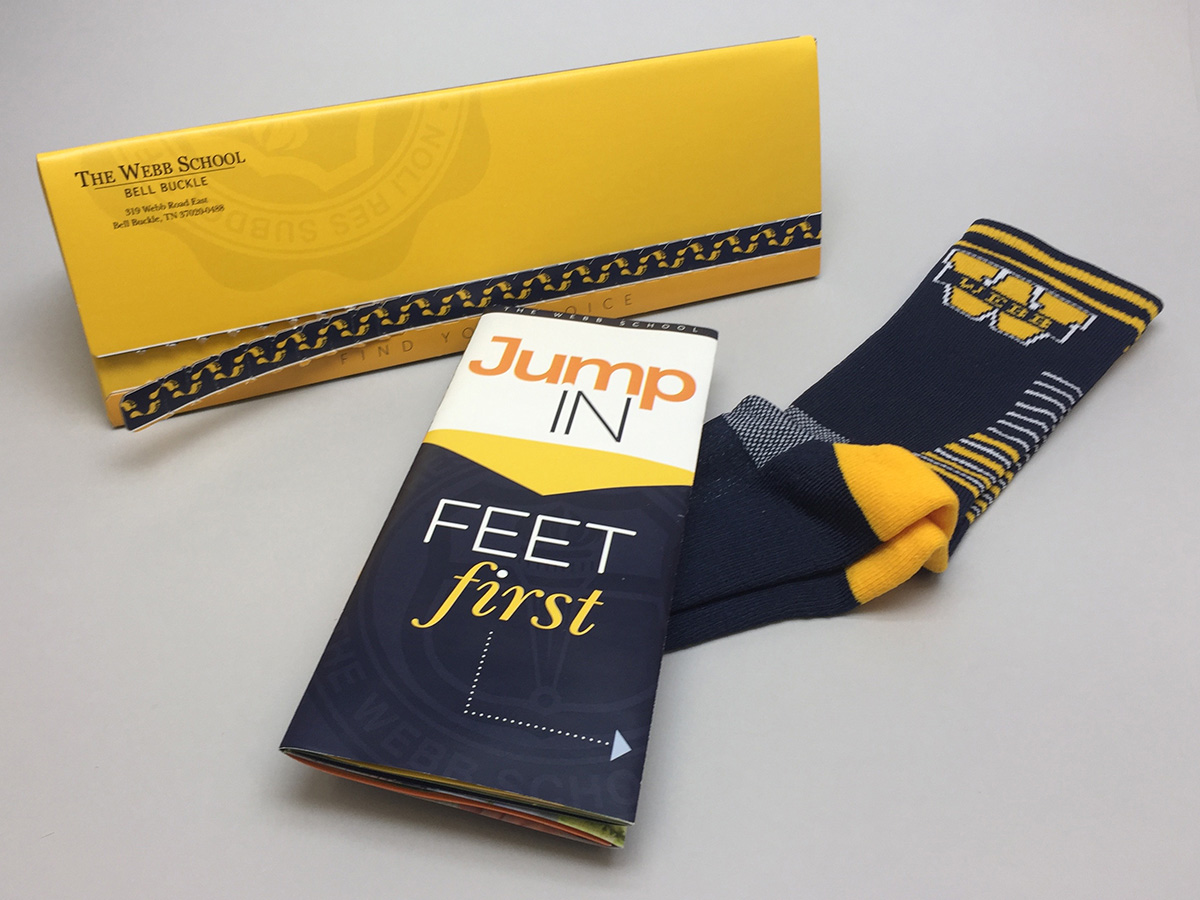 For the Webb acceptance, CEH Design put together a fun package around the theme of Webb’s mascot, an oversized sneaker. The gift of a pair of Webb School socks, a brochure that unfolds into a poster that is signed by current Webb students, and the acceptance letter arrived in a triangular-shaped box designed to surprise and delight admitted students. With the cover tagline “Jump In Feet First” and interior headlines that include “Find your Voice,” the brochure/poster carries through the theme with important information about Webb that motivates new admits to enroll.