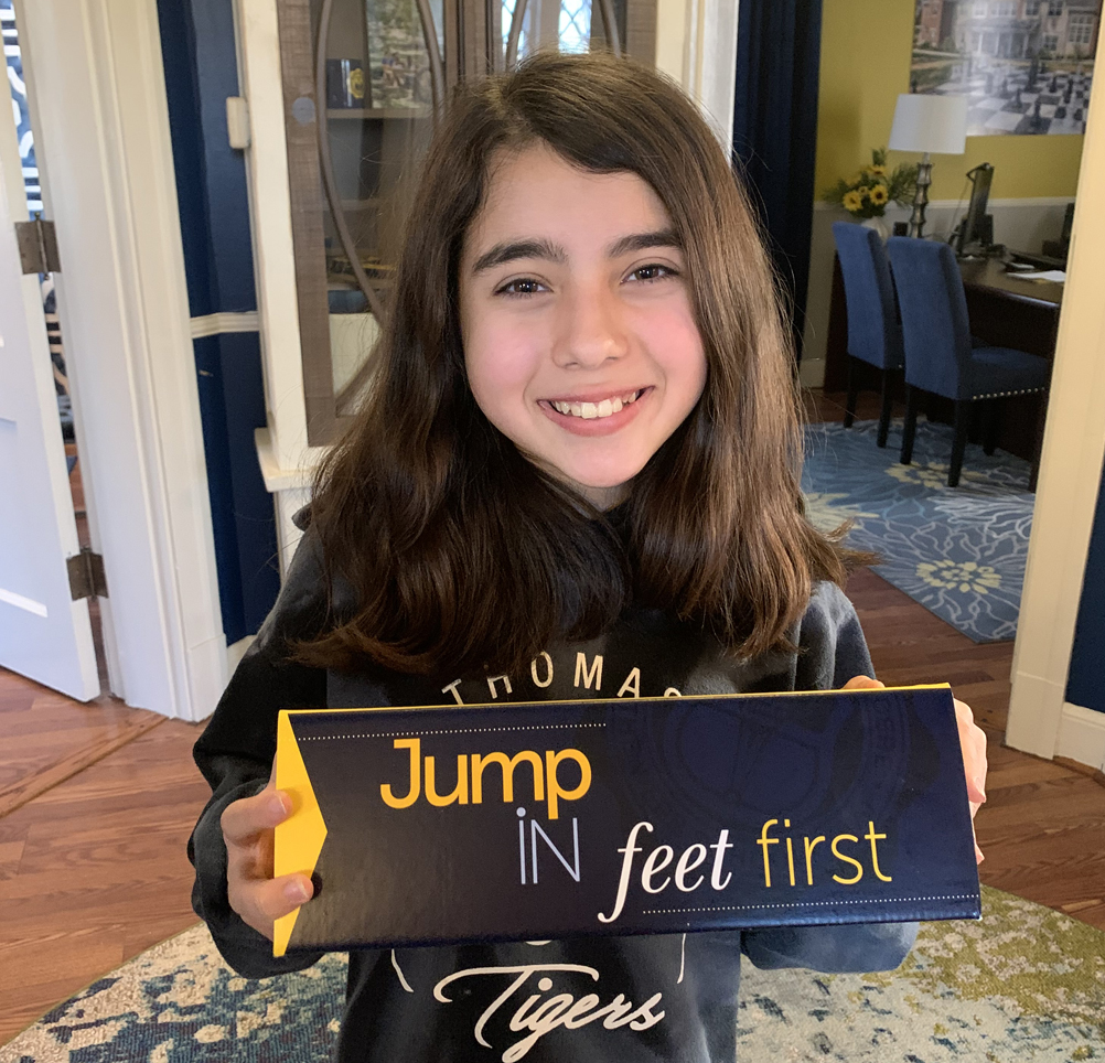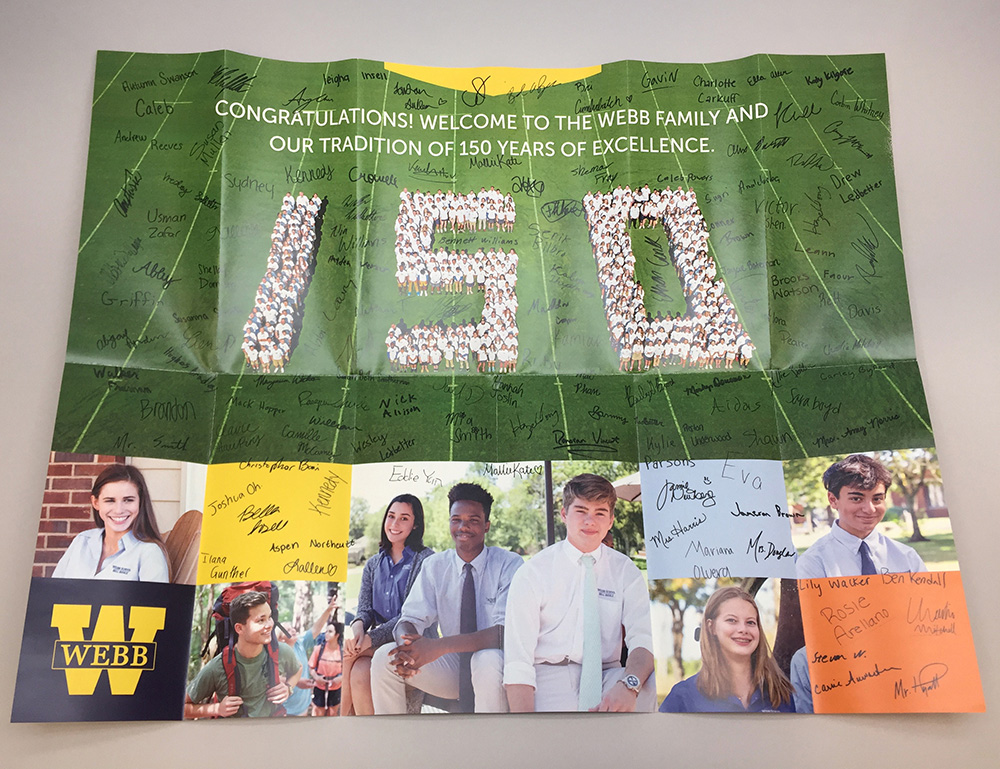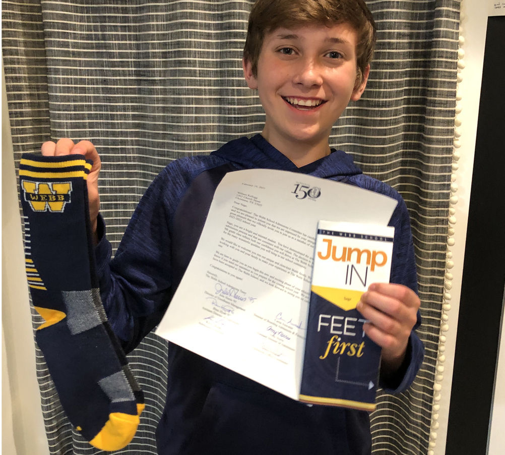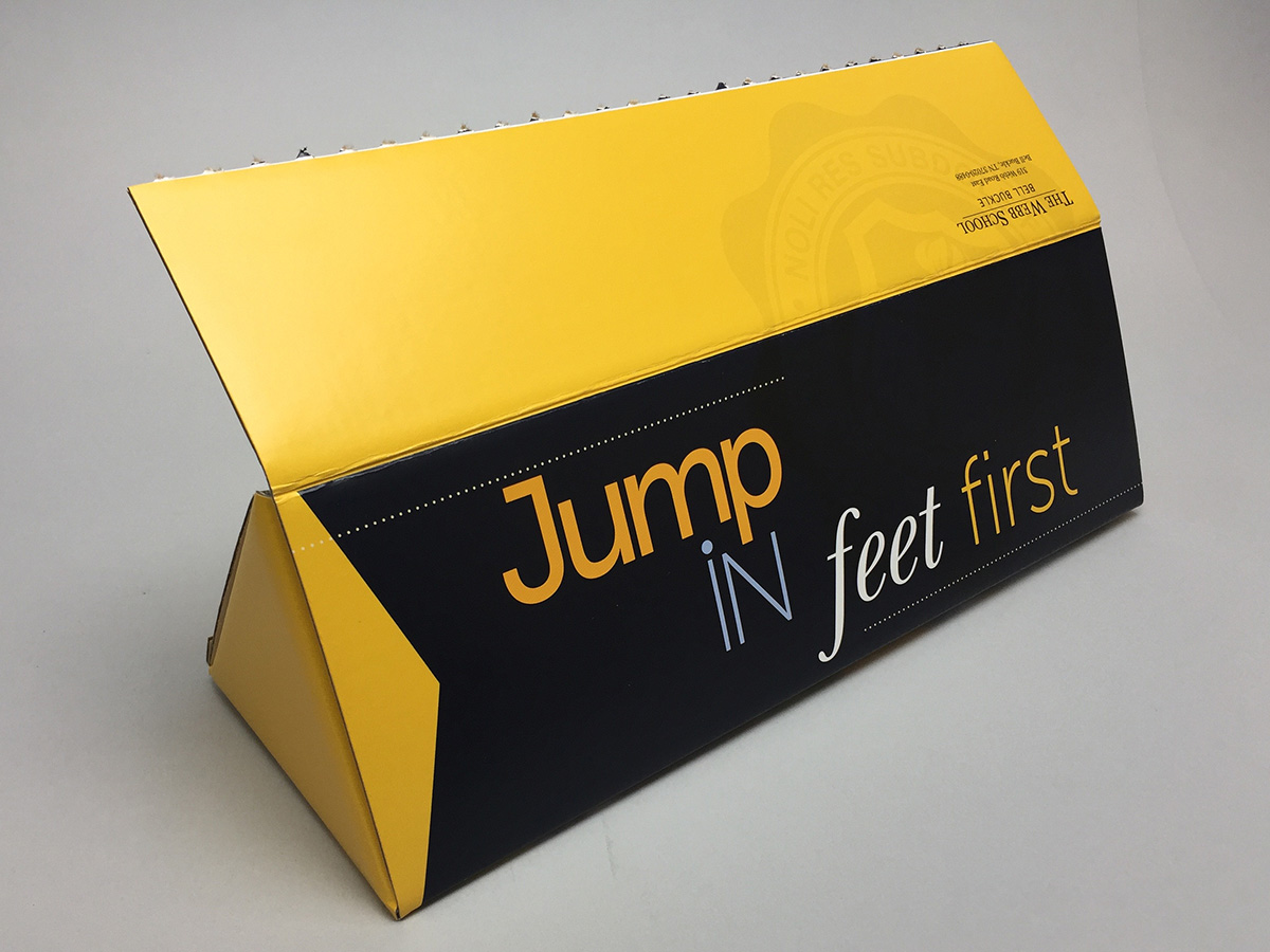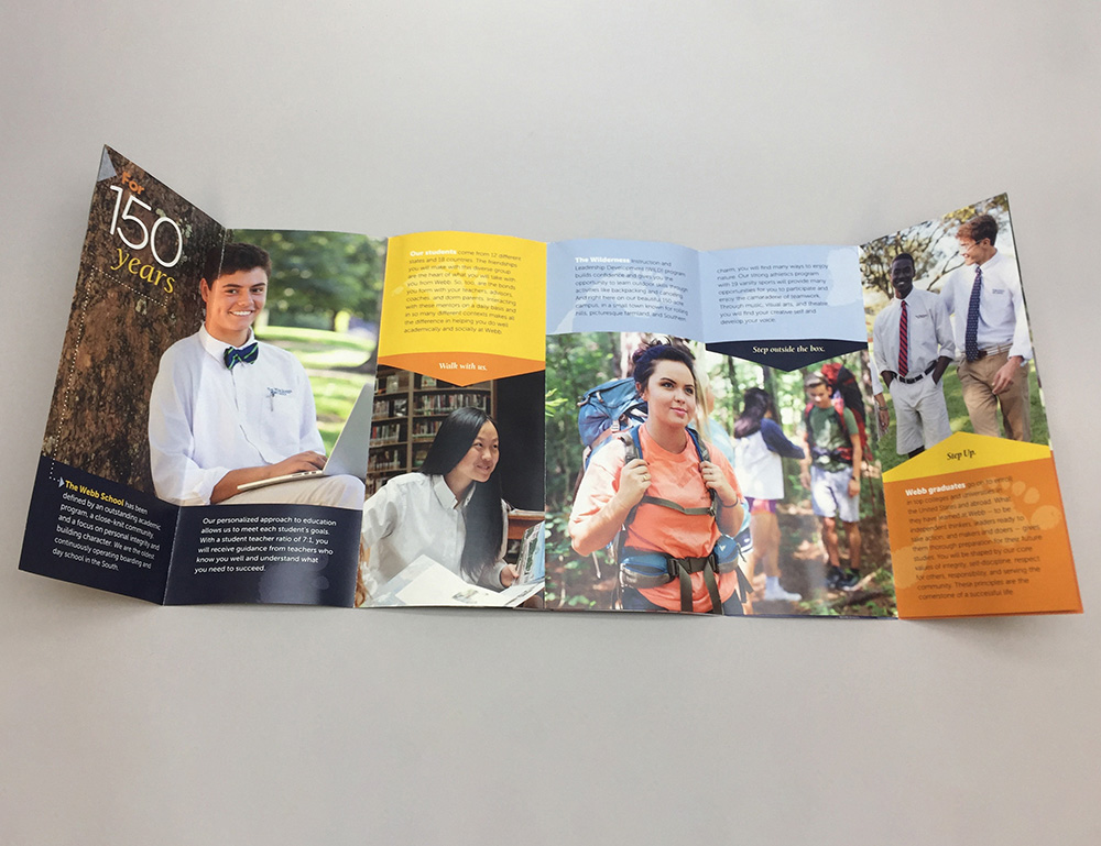 For the Webb acceptance, CEH Design put together a fun package around the theme of Webb’s mascot, an oversized sneaker. The gift of a pair of Webb School socks, a brochure that unfolds into a poster that is signed by current Webb students, and the acceptance letter arrived in a triangular-shaped box designed to surprise and delight admitted students. With the cover tagline “Jump In Feet First” and interior headlines that include “Find your Voice,” the brochure/poster carries through the theme with important information about Webb that motivates new admits to enroll.